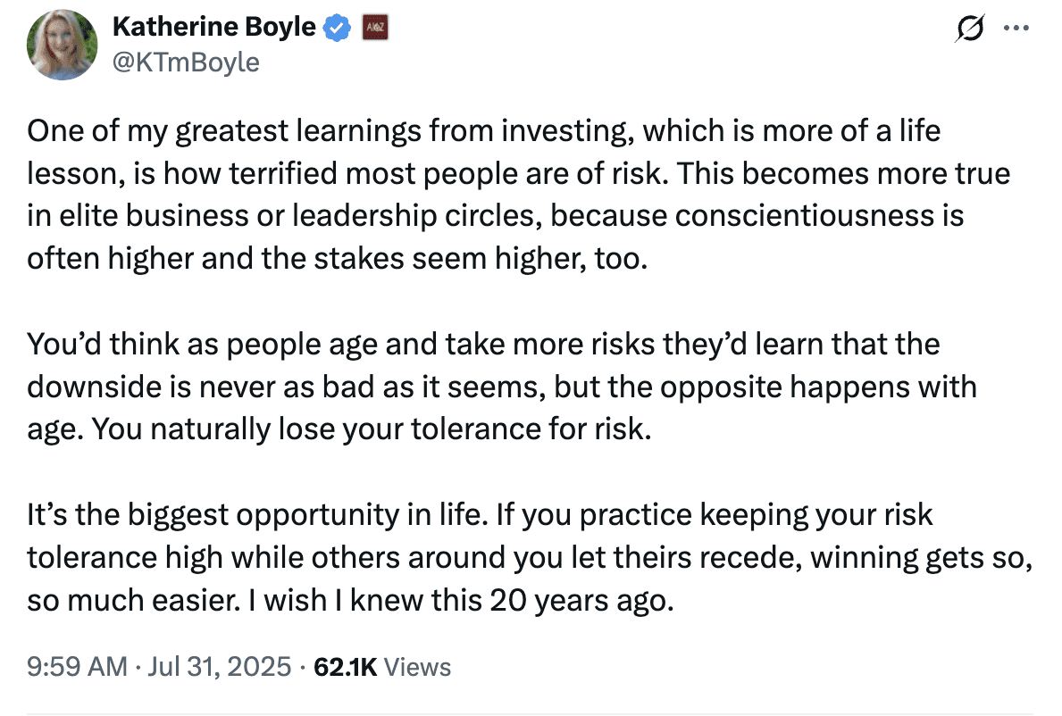 (This post nails it from Katherine @ a16z: risk as emotional resilience — learning to stay present through uncertainty.)