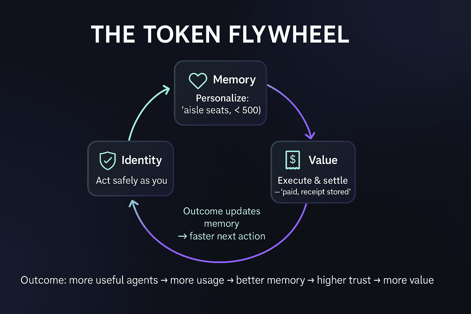 Outcome: more useful agents → more usage → better memory → higher trust → more value flowing through the system.