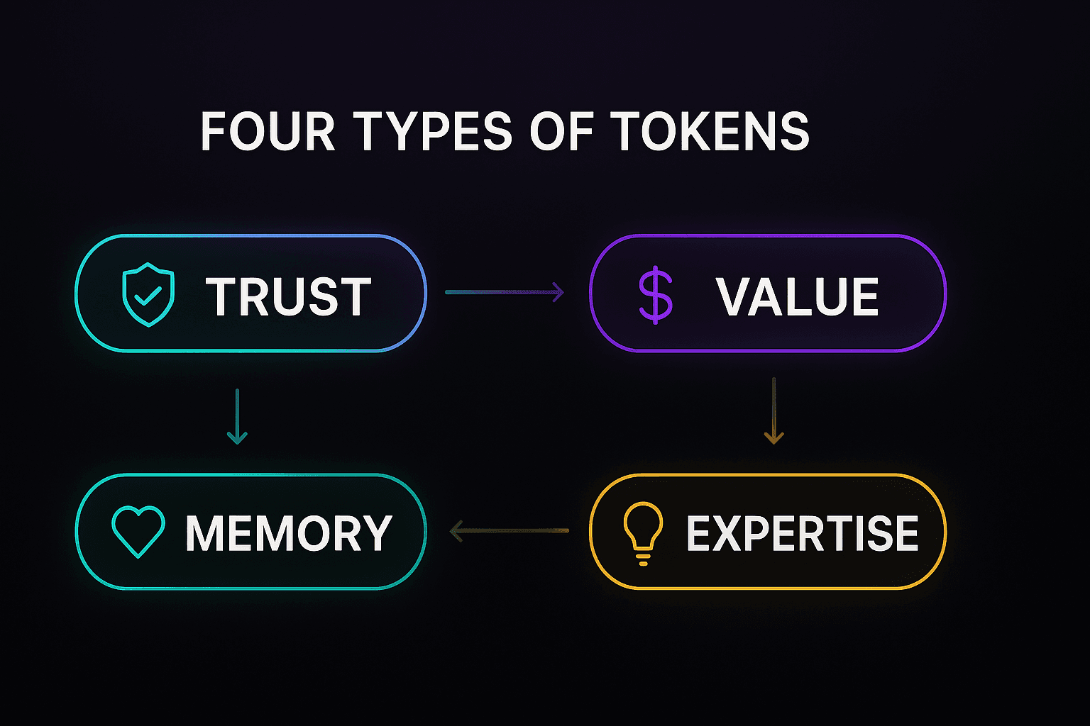 Trust/Value/Memory/Expertise tokens encode who/what, ownership, context, and know‑how so actions are authorized and personalized.